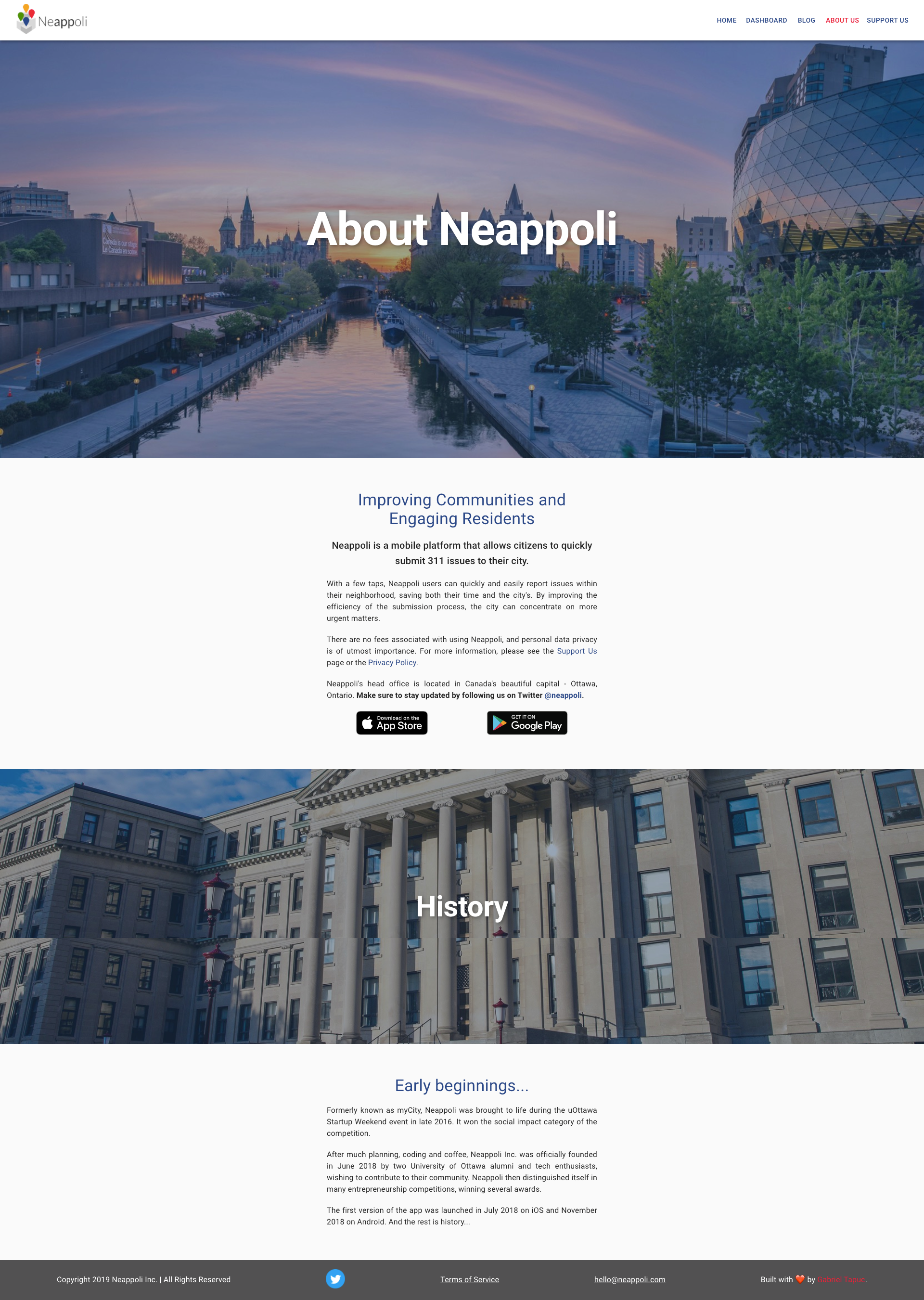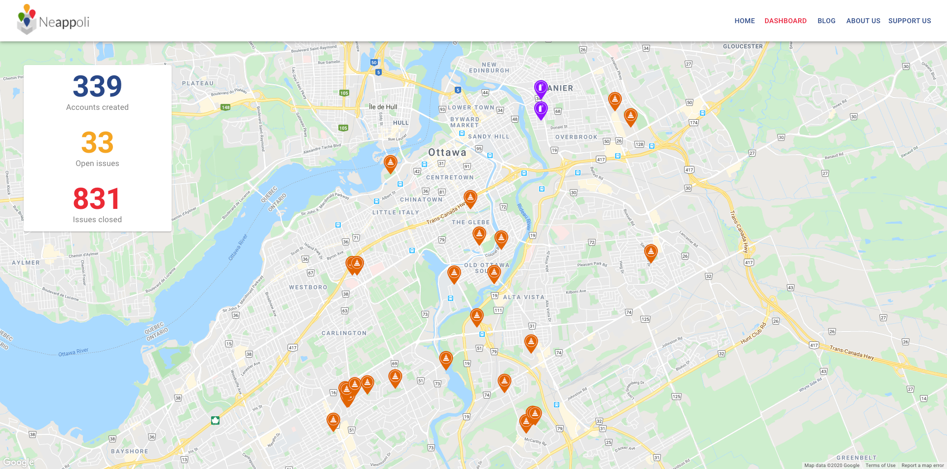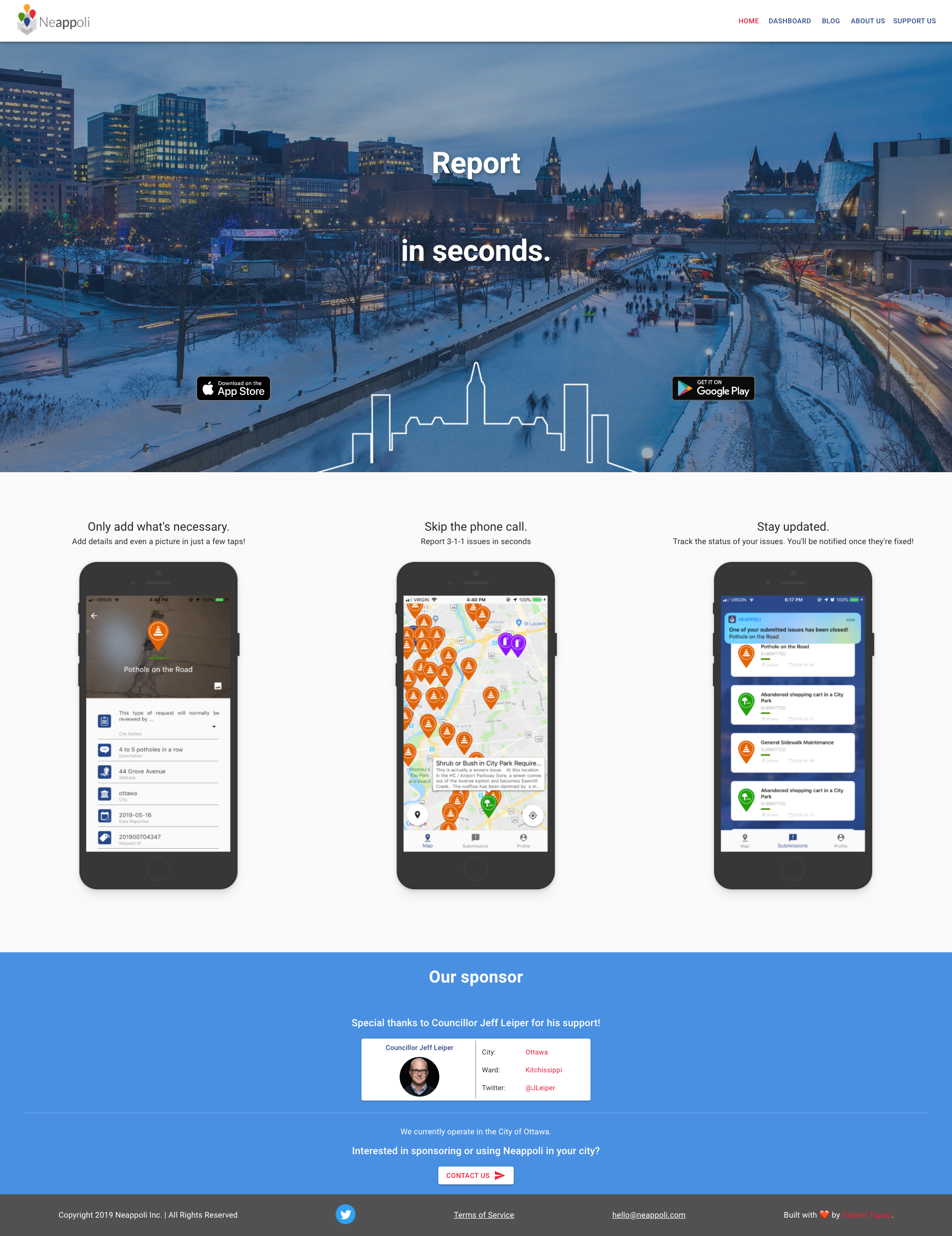 Neappoli is a mobile application that makes the process of submitting city issues very convenient: in a few taps, users will be able to submit non-urgent 3-1-1 issues without having to call the city. In a few taps, they can send and track a geotagged issue that has all the required information the city requires. Neappoli was built using Firebase and Flutter for reliability and cost saving purposes. It is currently serving the citizens of our national capital, Ottawa.