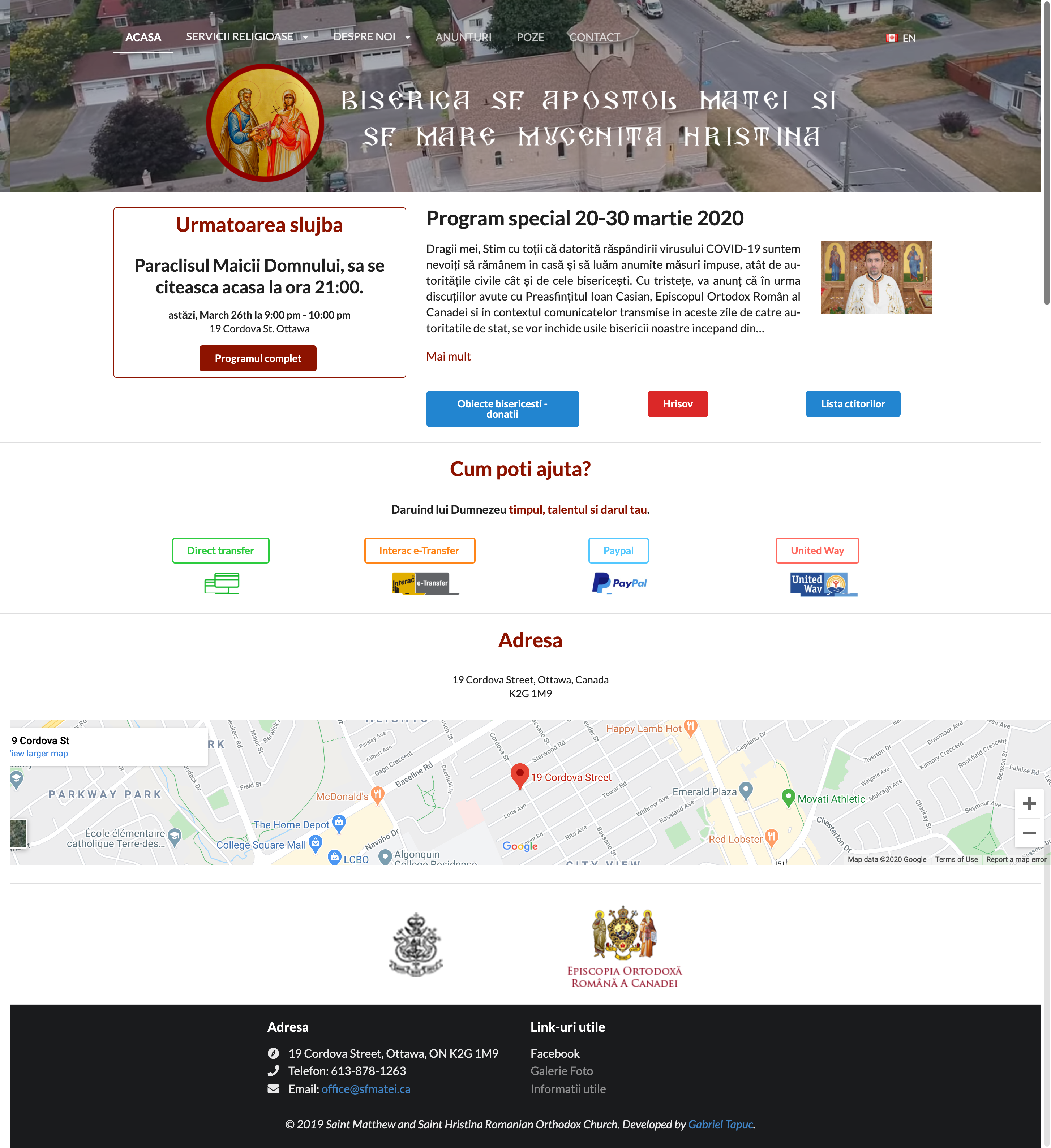 Built a responsive website in React (and Gatsby) for the St. Matthew and St. Hristina Romanian Orthodox church. The website can be viewed here: https://sfmatei.ca. It features: A photo gallery with a mechanism that makes it easy to upload new albums, Various events and posts pages which content is easy to add. edit and remove, A dynamic event notice that shows the upcoming events based on the schedule set by the minister, and a multiple language support.